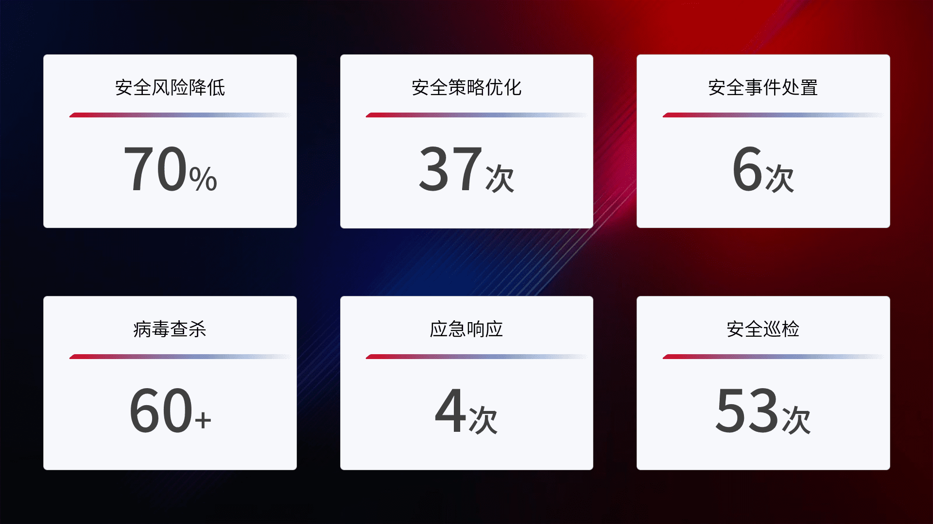 综合报告与文档服务: 定期提供安全事件处置报告、、、、周/季度总结报告和年度总结报告;详尽的文档服务可帮助客户了解网络安全状况,,,,支持决策制定和流程优化。。