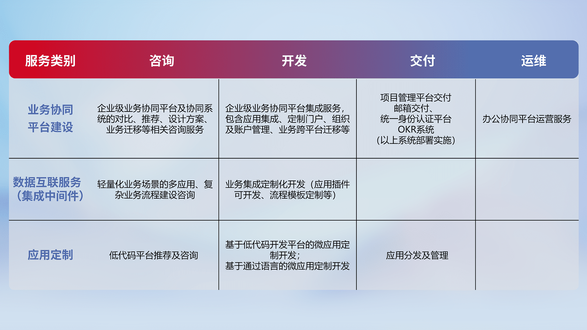 针对钉钉、、、企微、、、IDaas等平台级产品提供产品的规划、、、方案、、、交付、、、、定制化开发等服务,,,实现如统一协同办公、、智能客户服务、、混合会议管理、、、智能数据查询、、、等业务场景,,,,实现数字化转型。。。。